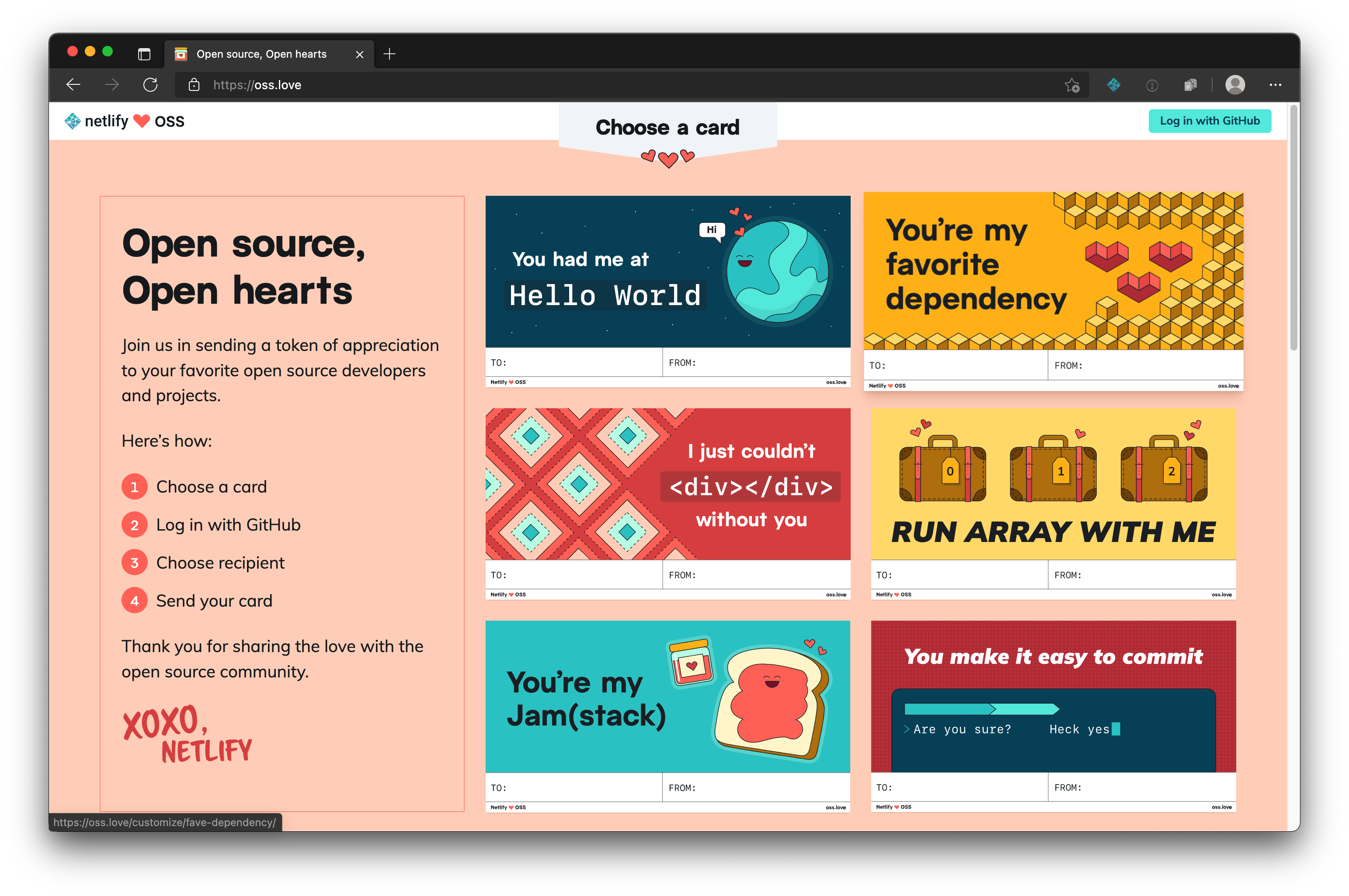 This site was built to allow people to express their appreciation of open source contributors and organisations by selecting a greeting card, adding a recipient and sender name, and generating a unique URL for their customised card which they could share. The site uses: